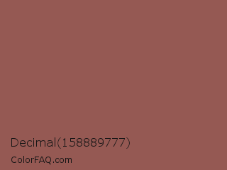 Decimal 158889777 Color is a normal red color and the nearest color is Rose Taupe #905d5d. Hex code #955953 and RGB value is rgb(149,89,83). In RGB color space, this color is composed of 58% red, 35% green, 33% blue, In CMYK color space, this color is composed of 0% cyan, 40% magenta, 44% yellow , 42% black , In HSL color space, this color has a hue angle of 5° , 28% saturation and 45% lightness.