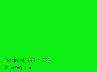 Decimal 9931107 Color is a normal green color and the nearest color is Green #00ff00. Hex code #0ef013 and RGB value is rgb(14,240,19). In RGB color space, this color is composed of 5% red, 94% green, 7% blue, In CMYK color space, this color is composed of 94% cyan, 0% magenta, 92% yellow , 6% black , In HSL color space, this color has a hue angle of 121° , 89% saturation and 50% lightness.