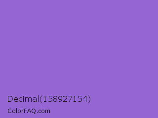 Decimal 158927154 Color is a light violet color and the nearest color is Amethyst #9966cc. Hex code #9565d4 and RGB value is rgb(149,101,212). In RGB color space, this color is composed of 58% red, 40% green, 83% blue, In CMYK color space, this color is composed of 30% cyan, 52% magenta, 0% yellow , 17% black , In HSL color space, this color has a hue angle of 266° , 56% saturation and 61% lightness.
