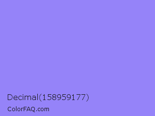 Decimal 158959177 Color is a light indigo color and the nearest color is Portage #8b9fee. Hex code #9583f9 and RGB value is rgb(149,131,249). In RGB color space, this color is composed of 58% red, 51% green, 98% blue, In CMYK color space, this color is composed of 40% cyan, 47% magenta, 0% yellow , 2% black , In HSL color space, this color has a hue angle of 249° , 91% saturation and 75% lightness.