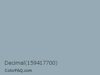 Decimal 159417700 Color is a light blue color and the nearest color is Gull Gray #9dacb7. Hex code #95aab4 and RGB value is rgb(149,170,180). In RGB color space, this color is composed of 58% red, 67% green, 71% blue, In CMYK color space, this color is composed of 17% cyan, 6% magenta, 0% yellow , 29% black , In HSL color space, this color has a hue angle of 199° , 17% saturation and 65% lightness.