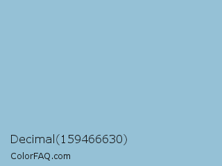 Decimal 159466630 Color is a light blue color and the nearest color is Dark Sky Blue #8cbed6. Hex code #95c1d6 and RGB value is rgb(149,193,214). In RGB color space, this color is composed of 58% red, 76% green, 84% blue, In CMYK color space, this color is composed of 30% cyan, 10% magenta, 0% yellow , 16% black , In HSL color space, this color has a hue angle of 199° , 44% saturation and 71% lightness.