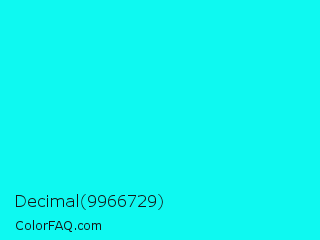 Decimal 9966729 Color is a normal cyan color and the nearest color is Turquoise Blue #00ffef. Hex code #0ef9f1 and RGB value is rgb(14,249,241). In RGB color space, this color is composed of 5% red, 98% green, 95% blue, In CMYK color space, this color is composed of 94% cyan, 0% magenta, 3% yellow , 2% black , In HSL color space, this color has a hue angle of 178° , 95% saturation and 52% lightness.