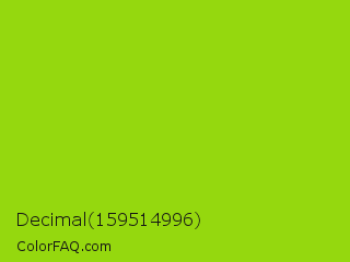 Decimal 159514996 Color is a normal green color and the nearest color is Sheen Green #8fd400. Hex code #95d80e and RGB value is rgb(149,216,14). In RGB color space, this color is composed of 58% red, 85% green, 5% blue, In CMYK color space, this color is composed of 31% cyan, 0% magenta, 94% yellow , 15% black , In HSL color space, this color has a hue angle of 80° , 88% saturation and 45% lightness.
