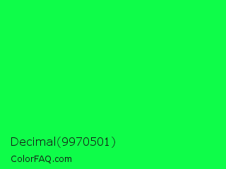 Decimal 9970501 Color is a normal green color and the nearest color is Malachite #0bda51. Hex code #0efd49 and RGB value is rgb(14,253,73). In RGB color space, this color is composed of 5% red, 99% green, 29% blue, In CMYK color space, this color is composed of 94% cyan, 0% magenta, 71% yellow , 1% black , In HSL color space, this color has a hue angle of 135° , 98% saturation and 52% lightness.