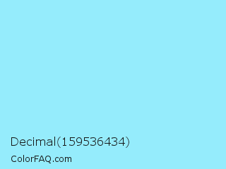 Decimal 159536434 Color is a light cyan color and the nearest color is Anakiwa #9de5ff. Hex code #95ecfc and RGB value is rgb(149,236,252). In RGB color space, this color is composed of 58% red, 93% green, 99% blue, In CMYK color space, this color is composed of 41% cyan, 6% magenta, 0% yellow , 1% black , In HSL color space, this color has a hue angle of 189° , 94% saturation and 79% lightness.