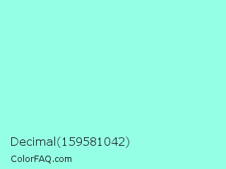 Decimal 159581042 Color is a light cyan color and the nearest color is Water Leaf #a1e9de. Hex code #95ffe4 and RGB value is rgb(149,255,228). In RGB color space, this color is composed of 58% red, 100% green, 89% blue, In CMYK color space, this color is composed of 42% cyan, 0% magenta, 11% yellow , 0% black , In HSL color space, this color has a hue angle of 165° , 100% saturation and 79% lightness.