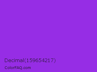 Decimal 159654217 Color is a normal purple color and the nearest color is Blue Violet #8a2be2. Hex code #962de5 and RGB value is rgb(150,45,229). In RGB color space, this color is composed of 59% red, 18% green, 90% blue, In CMYK color space, this color is composed of 34% cyan, 80% magenta, 0% yellow , 10% black , In HSL color space, this color has a hue angle of 274° , 78% saturation and 54% lightness.