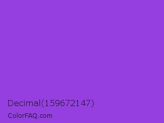 Decimal 159672147 Color is a normal purple color and the nearest color is Blue Violet #8a2be2. Hex code #963fe1 and RGB value is rgb(150,63,225). In RGB color space, this color is composed of 59% red, 25% green, 88% blue, In CMYK color space, this color is composed of 33% cyan, 72% magenta, 0% yellow , 12% black , In HSL color space, this color has a hue angle of 272° , 73% saturation and 56% lightness.