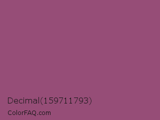 Decimal 159711793 Color is a normal magenta color and the nearest color is Sugar Plum #914e75. Hex code #964d77 and RGB value is rgb(150,77,119). In RGB color space, this color is composed of 59% red, 30% green, 47% blue, In CMYK color space, this color is composed of 0% cyan, 49% magenta, 21% yellow , 41% black , In HSL color space, this color has a hue angle of 325° , 32% saturation and 45% lightness.
