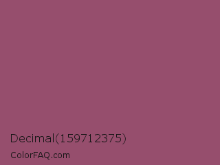 Decimal 159712375 Color is a normal rose color and the nearest color is Sugar Plum #914e75. Hex code #964e6d and RGB value is rgb(150,78,109). In RGB color space, this color is composed of 59% red, 31% green, 43% blue, In CMYK color space, this color is composed of 0% cyan, 48% magenta, 27% yellow , 41% black , In HSL color space, this color has a hue angle of 334° , 32% saturation and 45% lightness.