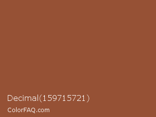 Decimal 159715721 Color is a normal orange color and the nearest color is Potters Clay #8c5738. Hex code #965135 and RGB value is rgb(150,81,53). In RGB color space, this color is composed of 59% red, 32% green, 21% blue, In CMYK color space, this color is composed of 0% cyan, 46% magenta, 65% yellow , 41% black , In HSL color space, this color has a hue angle of 17° , 48% saturation and 40% lightness.