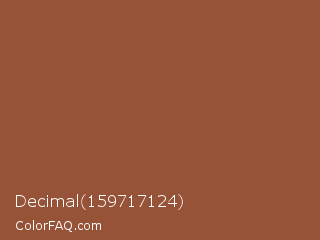Decimal 159717124 Color is a normal orange color and the nearest color is Coconut #965a3e. Hex code #965338 and RGB value is rgb(150,83,56). In RGB color space, this color is composed of 59% red, 33% green, 22% blue, In CMYK color space, this color is composed of 0% cyan, 45% magenta, 63% yellow , 41% black , In HSL color space, this color has a hue angle of 17° , 46% saturation and 40% lightness.