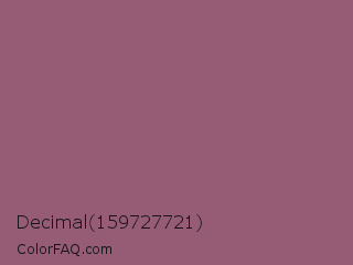 Decimal 159727721 Color is a normal rose color and the nearest color is Mauve Taupe #915f6d. Hex code #965c75 and RGB value is rgb(150,92,117). In RGB color space, this color is composed of 59% red, 36% green, 46% blue, In CMYK color space, this color is composed of 0% cyan, 39% magenta, 22% yellow , 41% black , In HSL color space, this color has a hue angle of 334° , 24% saturation and 47% lightness.