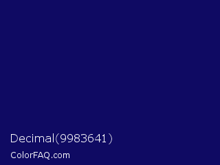 Decimal 9983641 Color is a very dark indigo color and the nearest color is Arapawa #110c6c. Hex code #0f0a63 and RGB value is rgb(15,10,99). In RGB color space, this color is composed of 6% red, 4% green, 39% blue, In CMYK color space, this color is composed of 85% cyan, 90% magenta, 0% yellow , 61% black , In HSL color space, this color has a hue angle of 243° , 82% saturation and 21% lightness.