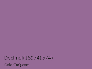 Decimal 159741574 Color is a normal magenta color and the nearest color is Trendy Pink #8c6495. Hex code #966a96 and RGB value is rgb(150,106,150). In RGB color space, this color is composed of 59% red, 42% green, 59% blue, In CMYK color space, this color is composed of 0% cyan, 29% magenta, 0% yellow , 41% black , In HSL color space, this color has a hue angle of 300° , 17% saturation and 50% lightness.