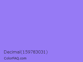 Decimal 159783031 Color is a light indigo color and the nearest color is Medium Purple #9370db. Hex code #967af5 and RGB value is rgb(150,122,245). In RGB color space, this color is composed of 59% red, 48% green, 96% blue, In CMYK color space, this color is composed of 39% cyan, 50% magenta, 0% yellow , 4% black , In HSL color space, this color has a hue angle of 254° , 86% saturation and 72% lightness.