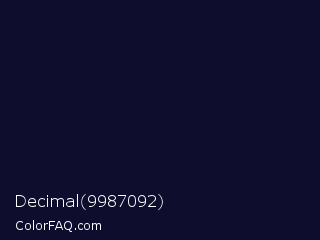 Decimal 9987092 Color is a very dark indigo color and the nearest color is Black Rock #0d0332. Hex code #0f0d2e and RGB value is rgb(15,13,46). In RGB color space, this color is composed of 6% red, 5% green, 18% blue, In CMYK color space, this color is composed of 67% cyan, 72% magenta, 0% yellow , 82% black , In HSL color space, this color has a hue angle of 244° , 56% saturation and 12% lightness.