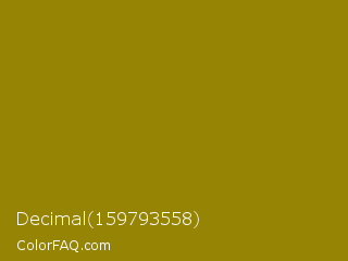 Decimal 159793558 Color is a dark yellow color and the nearest color is Dark Yellow #9b870c. Hex code #968404 and RGB value is rgb(150,132,4). In RGB color space, this color is composed of 59% red, 52% green, 2% blue, In CMYK color space, this color is composed of 0% cyan, 12% magenta, 97% yellow , 41% black , In HSL color space, this color has a hue angle of 53° , 95% saturation and 30% lightness.
