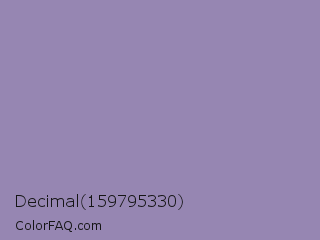 Decimal 159795330 Color is a light violet color and the nearest color is Lavender Purple #967bb6. Hex code #9686b2 and RGB value is rgb(150,134,178). In RGB color space, this color is composed of 59% red, 53% green, 70% blue, In CMYK color space, this color is composed of 16% cyan, 25% magenta, 0% yellow , 30% black , In HSL color space, this color has a hue angle of 262° , 22% saturation and 61% lightness.