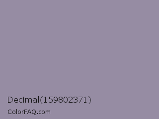 Decimal 159802371 Color is a normal violet color and the nearest color is Manatee Crayola #8d90a1. Hex code #968ca3 and RGB value is rgb(150,140,163). In RGB color space, this color is composed of 59% red, 55% green, 64% blue, In CMYK color space, this color is composed of 8% cyan, 14% magenta, 0% yellow , 36% black , In HSL color space, this color has a hue angle of 266° , 11% saturation and 59% lightness.