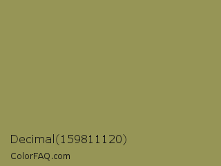 Decimal 159811120 Color is a normal yellow color and the nearest color is Moss Green #8a9a5b. Hex code #969556 and RGB value is rgb(150,149,86). In RGB color space, this color is composed of 59% red, 58% green, 34% blue, In CMYK color space, this color is composed of 0% cyan, 1% magenta, 43% yellow , 41% black , In HSL color space, this color has a hue angle of 59° , 27% saturation and 46% lightness.