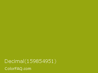 Decimal 159854951 Color is a normal yellow color and the nearest color is Citron #9fa91f. Hex code #96a70f and RGB value is rgb(150,167,15). In RGB color space, this color is composed of 59% red, 65% green, 6% blue, In CMYK color space, this color is composed of 10% cyan, 0% magenta, 91% yellow , 35% black , In HSL color space, this color has a hue angle of 67° , 84% saturation and 36% lightness.