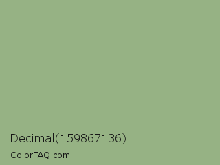 Decimal 159867136 Color is a light green color and the nearest color is Sage #9ea587. Hex code #96b284 and RGB value is rgb(150,178,132). In RGB color space, this color is composed of 59% red, 70% green, 52% blue, In CMYK color space, this color is composed of 16% cyan, 0% magenta, 26% yellow , 30% black , In HSL color space, this color has a hue angle of 97° , 23% saturation and 61% lightness.