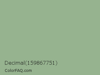 Decimal 159867751 Color is a light green color and the nearest color is Dark Sea Green #8fbc8f. Hex code #96b38f and RGB value is rgb(150,179,143). In RGB color space, this color is composed of 59% red, 70% green, 56% blue, In CMYK color space, this color is composed of 16% cyan, 0% magenta, 20% yellow , 30% black , In HSL color space, this color has a hue angle of 108° , 19% saturation and 63% lightness.