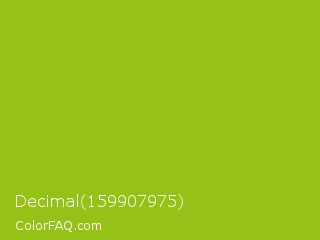 Decimal 159907975 Color is a normal lime color and the nearest color is Pistachio Green #9dc209. Hex code #96c217 and RGB value is rgb(150,194,23). In RGB color space, this color is composed of 59% red, 76% green, 9% blue, In CMYK color space, this color is composed of 23% cyan, 0% magenta, 88% yellow , 24% black , In HSL color space, this color has a hue angle of 75° , 79% saturation and 43% lightness.