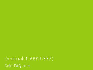 Decimal 159916337 Color is a normal lime color and the nearest color is Pistachio Green #9dc209. Hex code #96ca13 and RGB value is rgb(150,202,19). In RGB color space, this color is composed of 59% red, 79% green, 7% blue, In CMYK color space, this color is composed of 26% cyan, 0% magenta, 91% yellow , 21% black , In HSL color space, this color has a hue angle of 77° , 83% saturation and 43% lightness.