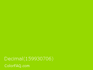 Decimal 159930706 Color is a normal lime color and the nearest color is Sheen Green #8fd400. Hex code #96d900 and RGB value is rgb(150,217,0). In RGB color space, this color is composed of 59% red, 85% green, 0% blue, In CMYK color space, this color is composed of 31% cyan, 0% magenta, 100% yellow , 15% black , In HSL color space, this color has a hue angle of 79° , 100% saturation and 43% lightness.