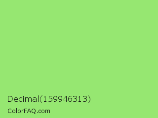 Decimal 159946313 Color is a light green color and the nearest color is Feijoa #9fdd8c. Hex code #96e771 and RGB value is rgb(150,231,113). In RGB color space, this color is composed of 59% red, 91% green, 44% blue, In CMYK color space, this color is composed of 35% cyan, 0% magenta, 51% yellow , 9% black , In HSL color space, this color has a hue angle of 101° , 71% saturation and 67% lightness.