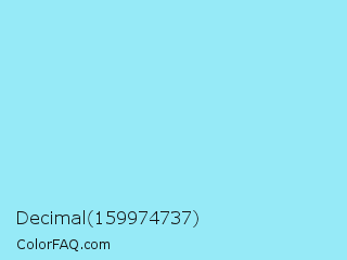 Decimal 159974737 Color is a light cyan color and the nearest color is Anakiwa #9de5ff. Hex code #96eaf7 and RGB value is rgb(150,234,247). In RGB color space, this color is composed of 59% red, 92% green, 97% blue, In CMYK color space, this color is composed of 39% cyan, 5% magenta, 0% yellow , 3% black , In HSL color space, this color has a hue angle of 188° , 86% saturation and 78% lightness.