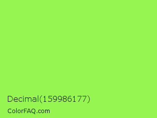 Decimal 159986177 Color is a light green color and the nearest color is Kiwi #8ee53f. Hex code #96f551 and RGB value is rgb(150,245,81). In RGB color space, this color is composed of 59% red, 96% green, 32% blue, In CMYK color space, this color is composed of 39% cyan, 0% magenta, 67% yellow , 4% black , In HSL color space, this color has a hue angle of 95° , 89% saturation and 64% lightness.