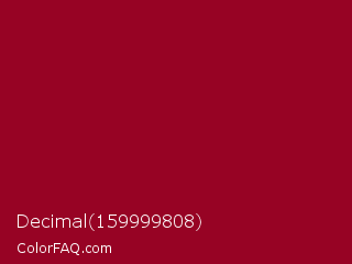 Decimal 159999808 Color is a dark red color and the nearest color is Dark Burgundy Red #900020. Hex code #970324 and RGB value is rgb(151,3,36). In RGB color space, this color is composed of 59% red, 1% green, 14% blue, In CMYK color space, this color is composed of 0% cyan, 98% magenta, 76% yellow , 41% black , In HSL color space, this color has a hue angle of 347° , 96% saturation and 30% lightness.