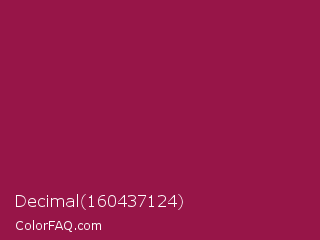 Decimal 160437124 Color is a normal rose color and the nearest color is Big Dip O Ruby #9c2542. Hex code #971548 and RGB value is rgb(151,21,72). In RGB color space, this color is composed of 59% red, 8% green, 28% blue, In CMYK color space, this color is composed of 0% cyan, 86% magenta, 52% yellow , 41% black , In HSL color space, this color has a hue angle of 336° , 76% saturation and 34% lightness.