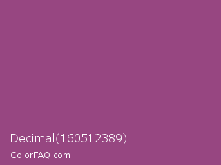 Decimal 160512389 Color is a normal magenta color and the nearest color is Plum #8e4585. Hex code #974681 and RGB value is rgb(151,70,129). In RGB color space, this color is composed of 59% red, 27% green, 51% blue, In CMYK color space, this color is composed of 0% cyan, 54% magenta, 15% yellow , 41% black , In HSL color space, this color has a hue angle of 316° , 37% saturation and 43% lightness.