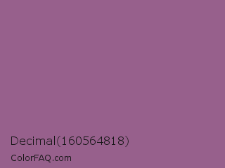 Decimal 160564818 Color is a normal magenta color and the nearest color is Strikemaster #956387. Hex code #97608c and RGB value is rgb(151,96,140). In RGB color space, this color is composed of 59% red, 38% green, 55% blue, In CMYK color space, this color is composed of 0% cyan, 36% magenta, 7% yellow , 41% black , In HSL color space, this color has a hue angle of 312° , 22% saturation and 48% lightness.