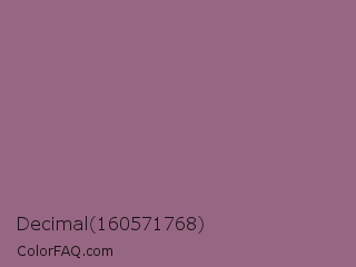 Decimal 160571768 Color is a normal magenta color and the nearest color is Strikemaster #956387. Hex code #976682 and RGB value is rgb(151,102,130). In RGB color space, this color is composed of 59% red, 40% green, 51% blue, In CMYK color space, this color is composed of 0% cyan, 32% magenta, 14% yellow , 41% black , In HSL color space, this color has a hue angle of 326° , 19% saturation and 50% lightness.