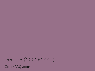 Decimal 160581445 Color is a normal magenta color and the nearest color is Mountbatten Pink #997a8d. Hex code #977089 and RGB value is rgb(151,112,137). In RGB color space, this color is composed of 59% red, 44% green, 54% blue, In CMYK color space, this color is composed of 0% cyan, 26% magenta, 9% yellow , 41% black , In HSL color space, this color has a hue angle of 322° , 16% saturation and 52% lightness.