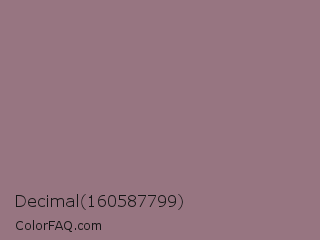 Decimal 160587799 Color is a normal rose color and the nearest color is Bazaar #98777b. Hex code #977581 and RGB value is rgb(151,117,129). In RGB color space, this color is composed of 59% red, 46% green, 51% blue, In CMYK color space, this color is composed of 0% cyan, 23% magenta, 15% yellow , 41% black , In HSL color space, this color has a hue angle of 339° , 14% saturation and 53% lightness.