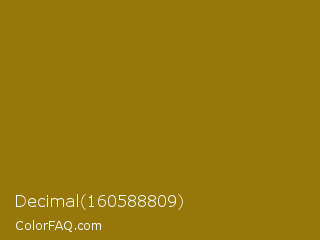 Decimal 160588809 Color is a normal yellow color and the nearest color is Buttered Rum #a1750d. Hex code #977709 and RGB value is rgb(151,119,9). In RGB color space, this color is composed of 59% red, 47% green, 4% blue, In CMYK color space, this color is composed of 0% cyan, 21% magenta, 94% yellow , 41% black , In HSL color space, this color has a hue angle of 46° , 89% saturation and 31% lightness.