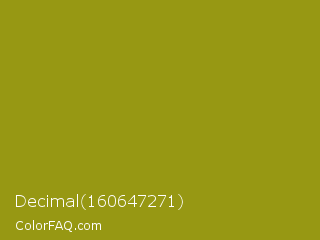 Decimal 160647271 Color is a normal yellow color and the nearest color is Dark Yellow #9b870c. Hex code #979813 and RGB value is rgb(151,152,19). In RGB color space, this color is composed of 59% red, 60% green, 7% blue, In CMYK color space, this color is composed of 1% cyan, 0% magenta, 88% yellow , 40% black , In HSL color space, this color has a hue angle of 60° , 78% saturation and 34% lightness.