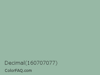 Decimal 160707077 Color is a light green color and the nearest color is Summer Green #96bbab. Hex code #97b8a5 and RGB value is rgb(151,184,165). In RGB color space, this color is composed of 59% red, 72% green, 65% blue, In CMYK color space, this color is composed of 18% cyan, 0% magenta, 10% yellow , 28% black , In HSL color space, this color has a hue angle of 145° , 19% saturation and 66% lightness.