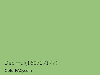 Decimal 160717177 Color is a light green color and the nearest color is Pistachio #93c572. Hex code #97c37b and RGB value is rgb(151,195,123). In RGB color space, this color is composed of 59% red, 76% green, 48% blue, In CMYK color space, this color is composed of 23% cyan, 0% magenta, 37% yellow , 24% black , In HSL color space, this color has a hue angle of 97° , 38% saturation and 62% lightness.