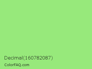 Decimal 160782087 Color is a light green color and the nearest color is Feijoa #9fdd8c. Hex code #97e97b and RGB value is rgb(151,233,123). In RGB color space, this color is composed of 59% red, 91% green, 48% blue, In CMYK color space, this color is composed of 35% cyan, 0% magenta, 47% yellow , 9% black , In HSL color space, this color has a hue angle of 105° , 71% saturation and 70% lightness.