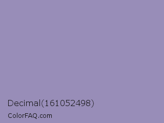 Decimal 161052498 Color is a light indigo color and the nearest color is Amethyst Smoke #a397b4. Hex code #988db8 and RGB value is rgb(152,141,184). In RGB color space, this color is composed of 60% red, 55% green, 72% blue, In CMYK color space, this color is composed of 17% cyan, 23% magenta, 0% yellow , 28% black , In HSL color space, this color has a hue angle of 255° , 23% saturation and 64% lightness.