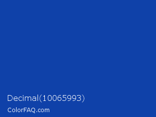 Decimal 10065993 Color is a normal blue color and the nearest color is Egyptian Blue #1034a6. Hex code #0f41a9 and RGB value is rgb(15,65,169). In RGB color space, this color is composed of 6% red, 25% green, 66% blue, In CMYK color space, this color is composed of 91% cyan, 62% magenta, 0% yellow , 34% black , In HSL color space, this color has a hue angle of 221° , 84% saturation and 36% lightness.