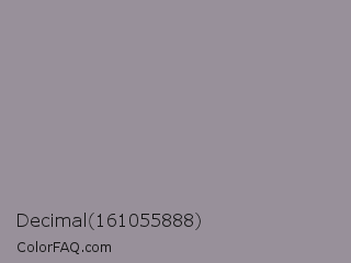 Decimal 161055888 Color is a normal purple color and the nearest color is Mountain Mist #959396. Hex code #98909a and RGB value is rgb(152,144,154). In RGB color space, this color is composed of 60% red, 56% green, 60% blue, In CMYK color space, this color is composed of 1% cyan, 6% magenta, 0% yellow , 40% black , In HSL color space, this color has a hue angle of 288° , 5% saturation and 58% lightness.
